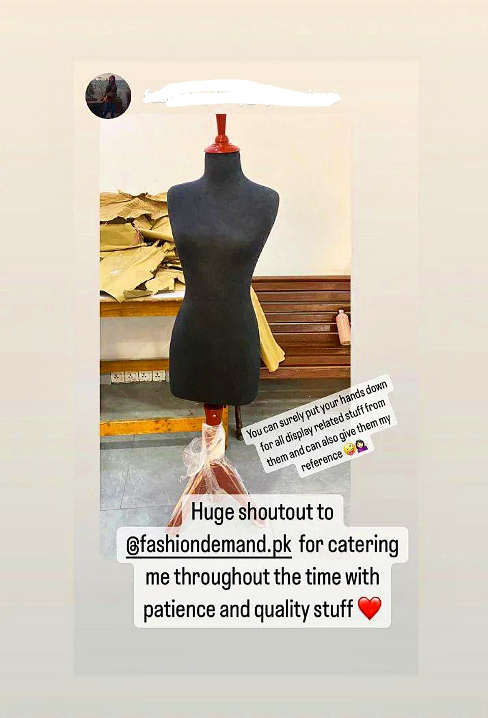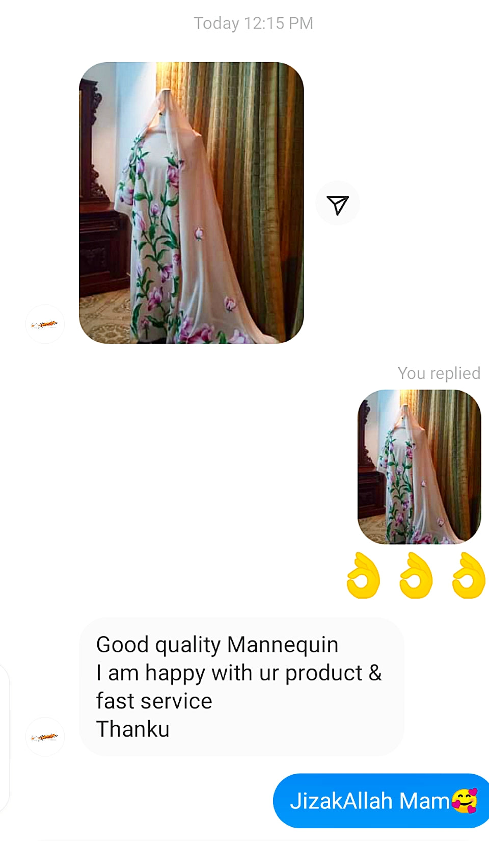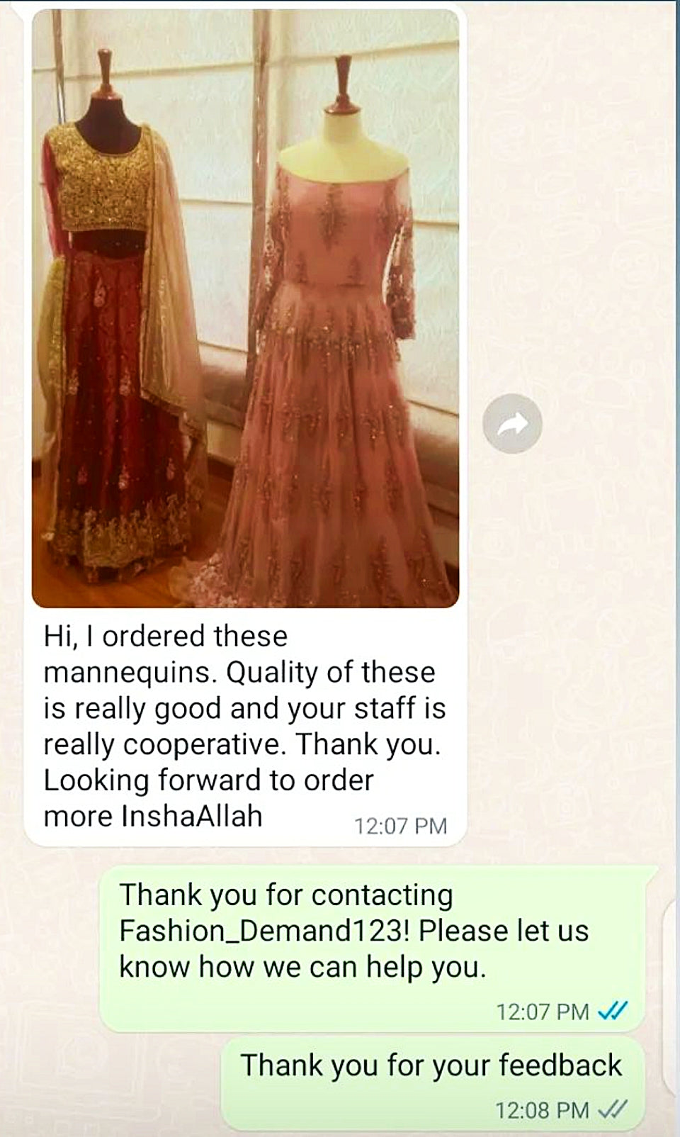 Customer Feedback after receiving Beautiful Mannequin fior Clothes Display.