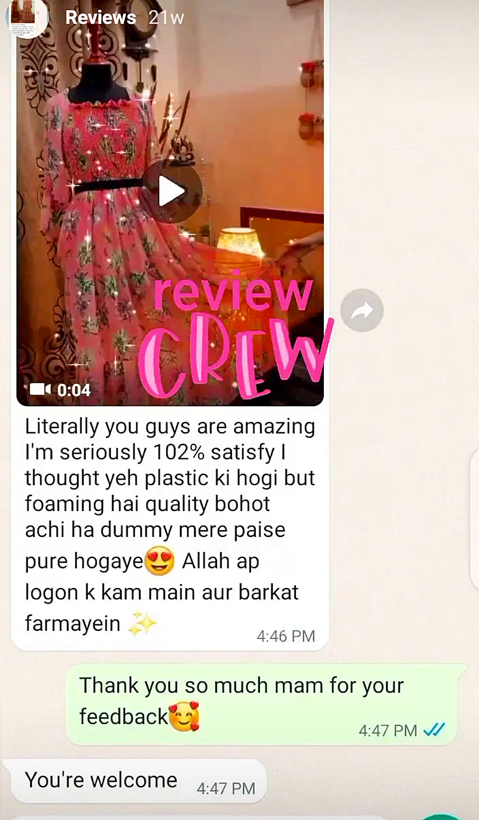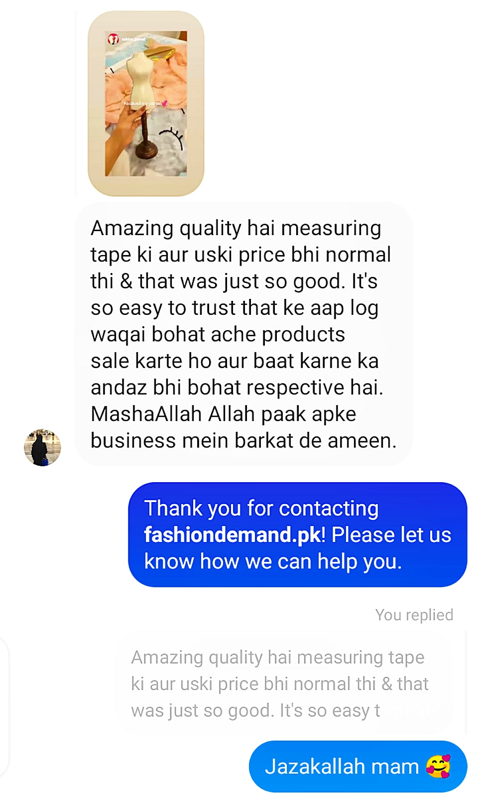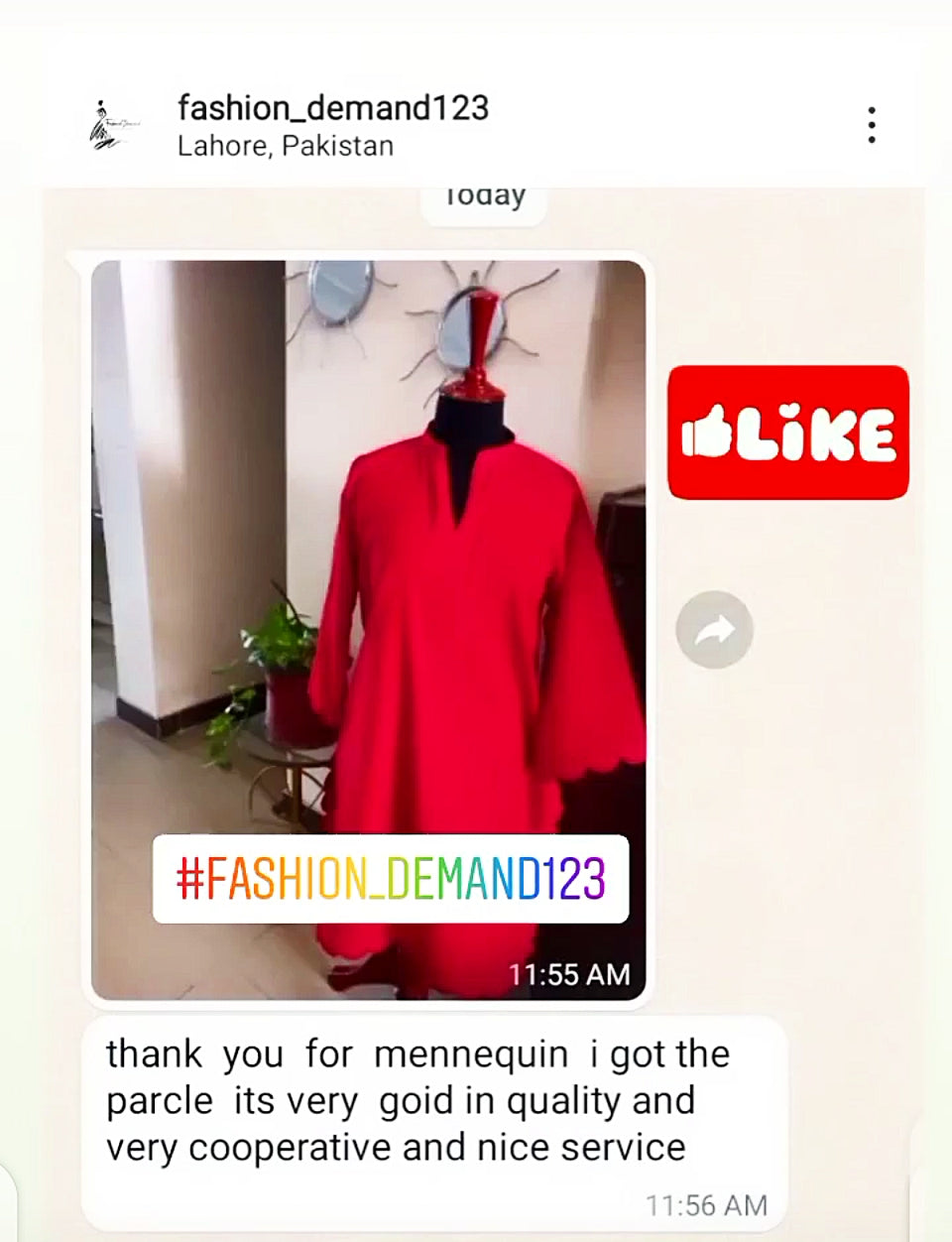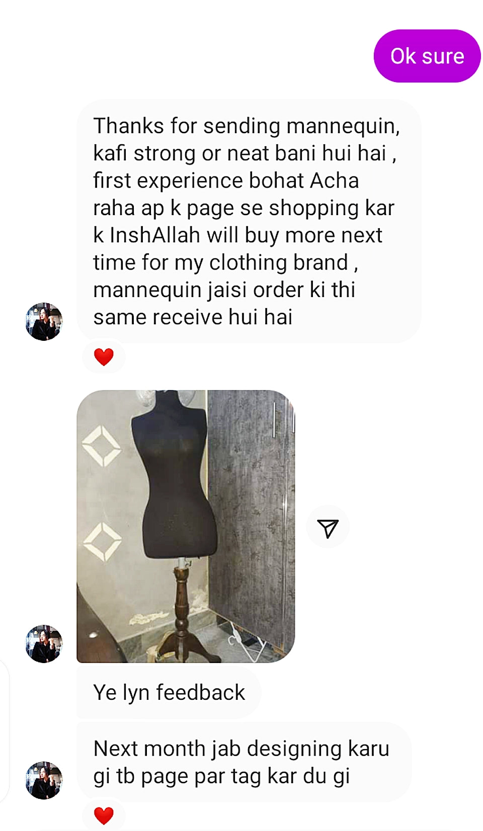 Customer Feedback after receiving Beautiful Mannequin fior Clothes Display.