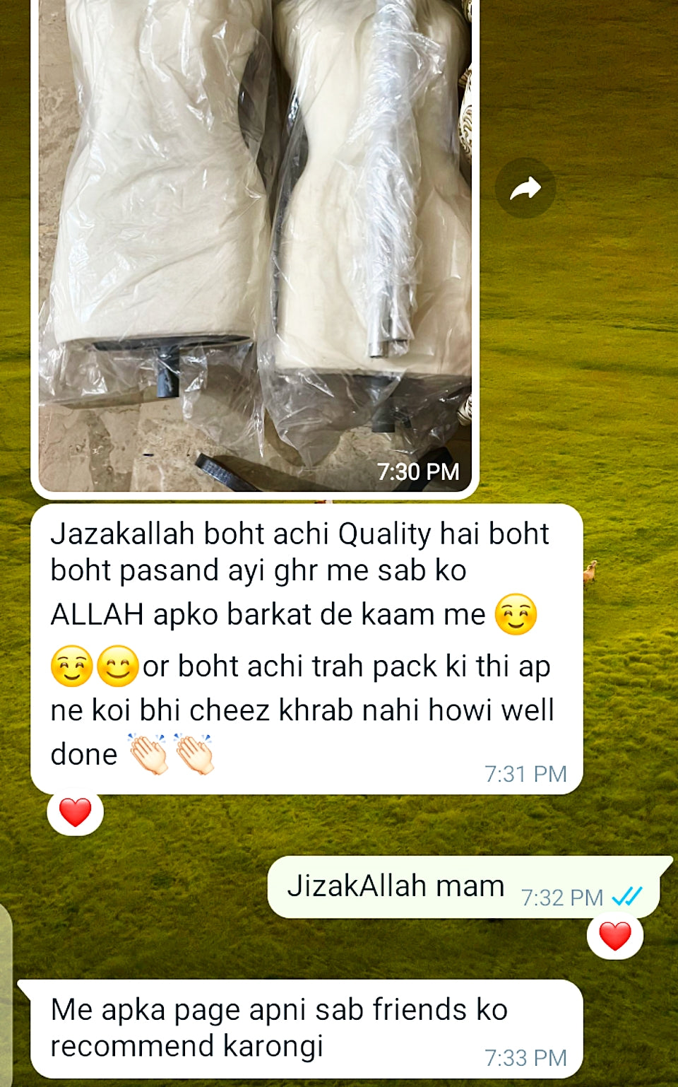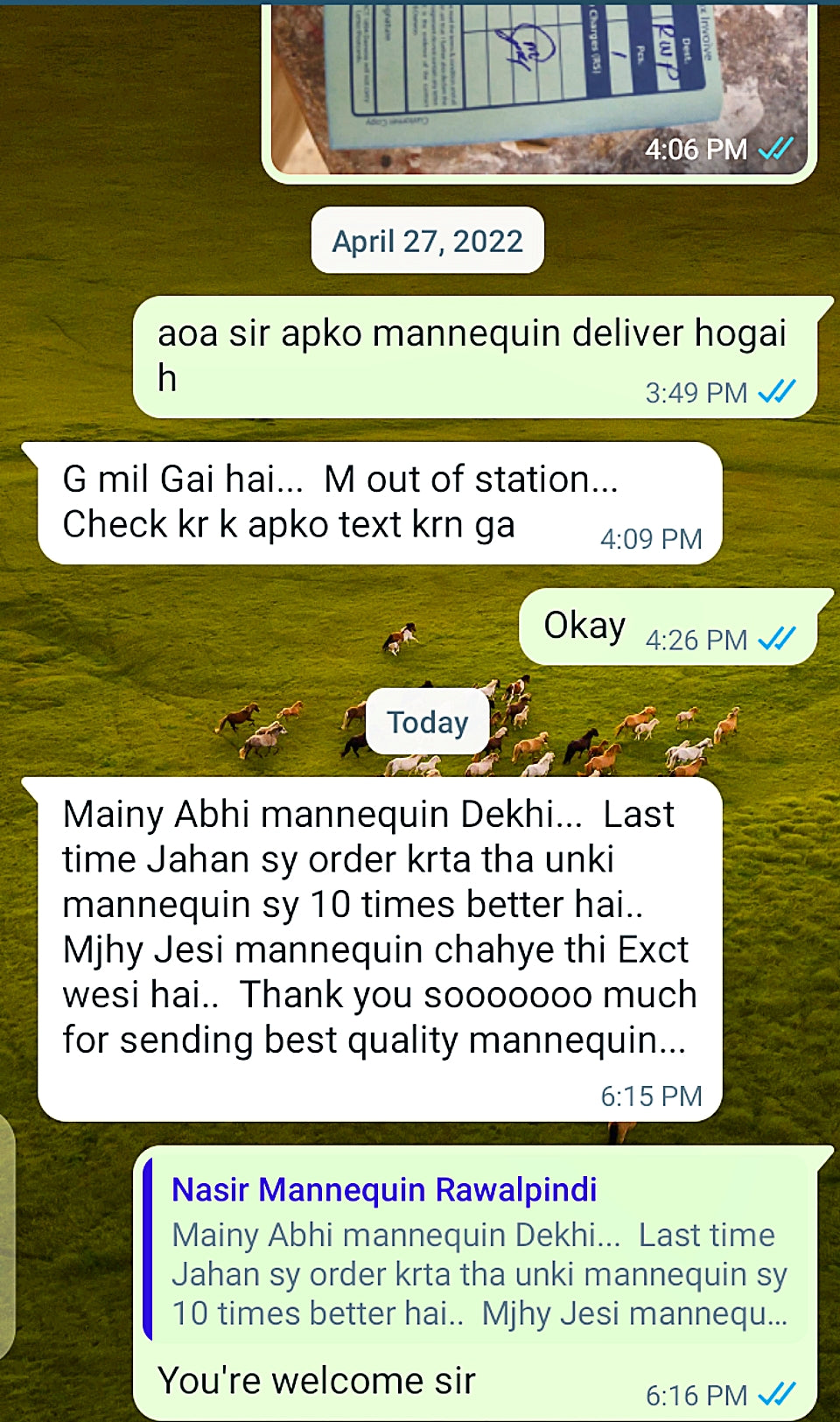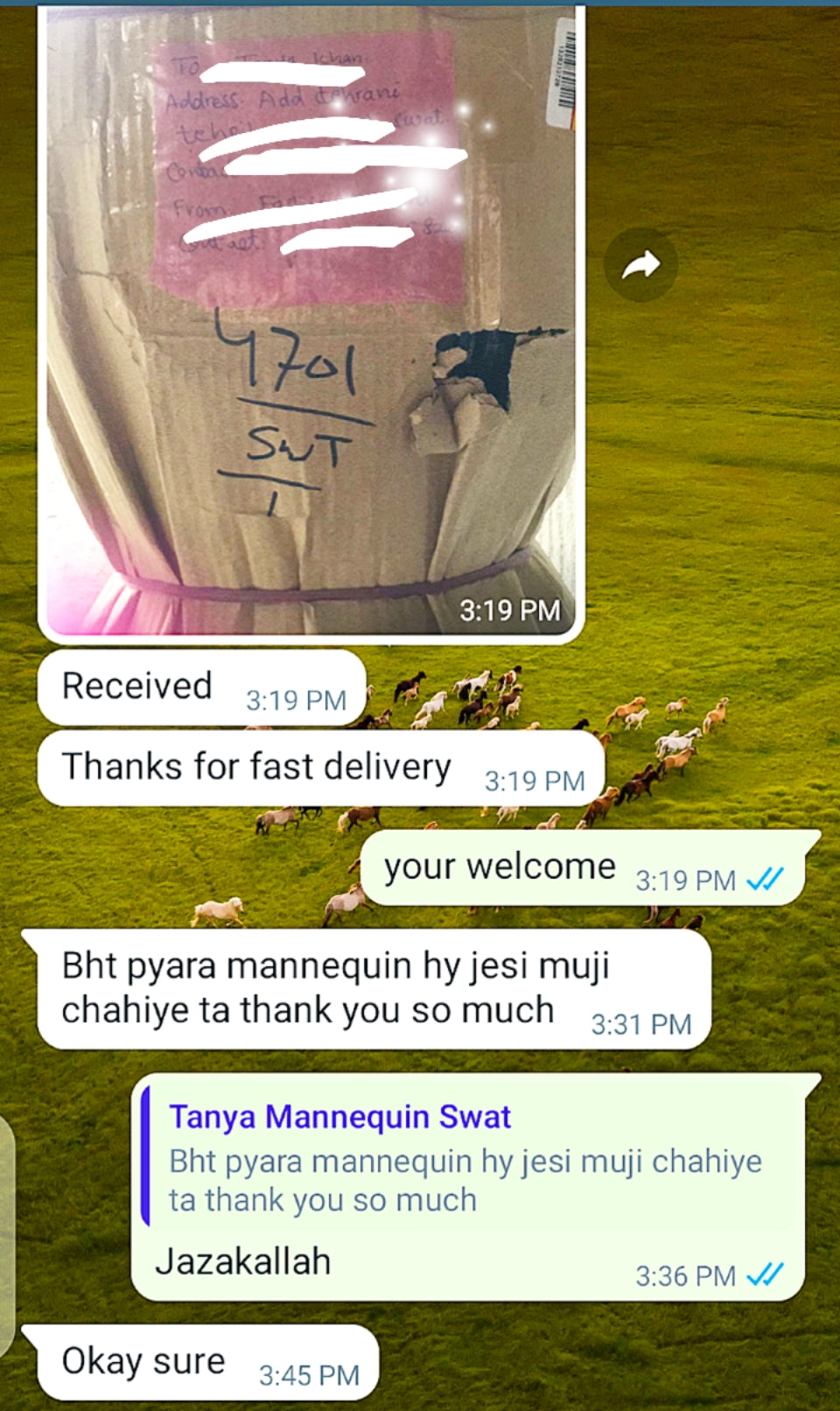Bhai thank you so much mujhe mannequin receive hogae bhot achi quality ha zabardast, Allah pak apky kam me aur barkat den Ameen.