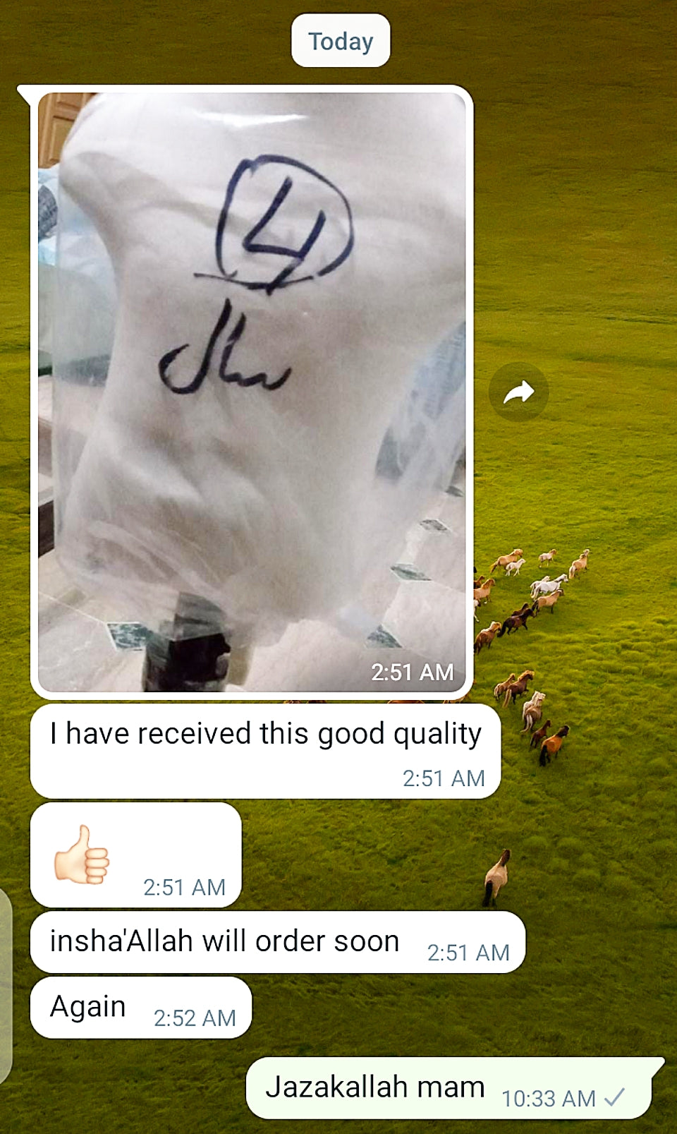 JazzakAllah Bhot achi Quality ha bhot bhot pasand ayi ha ghr me sab ko, Allah apko barkat de kaam me or bhot achi tra pack ki thi or koi b cheez kharab nh ai Well done.